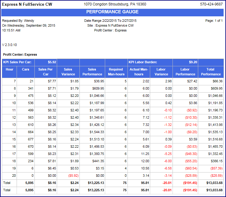 Like the Vehicle Statistical Performance report, the Performance Gauge report shows volume, sales, and labor performance indicators, hour-by-hour, for the selected date range and profit center. It also includes variance and performance numbers, which show absolute dollars, not just statistics. The Sales Variance will be greater than the Performance Indicator, if the wash is doing better than expected. The Sales Variance will be less than the Performance Indicator if the wash is doing poorly.