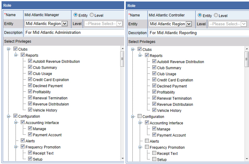 - Mid Atlantic Manager is given permission to all activities in the following menus: Clubs and Configuration.