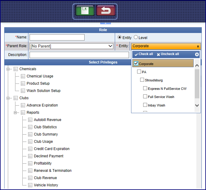 Click Entity to create the role for a specific group in the organizational layout such as a particular site.
