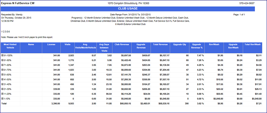 The Club Usage Report is a tool for managers at the Corporate level to view the club membership usage which is broken down in percentiles. This report can be used to view the totals from the Corporate level all the way down to the car wash site level.