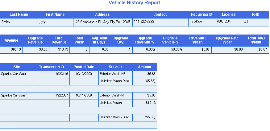 You need to use the Vehicle History report in conjunction with other reports. For example, you can first view the usage report to see customers who visit the wash very frequently. Then you can find a customer by searching for the license plate or RFID tag in the vehicle history report. Customers who visit the wash very frequently have a lower total revenue per wash amount. By enticing these customers to purchase upgrades, you can increase the total revenue per wash.