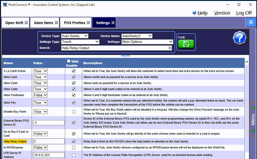 2. Configure in WashConnect settings: In the Help Relay Output setting, type 1, 2 or 3 depending on the relay selected in step #1.