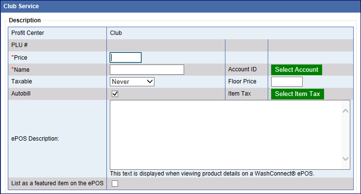- In the ePOS Description box, type a description to display on the optional WashConnect ePOS club page.