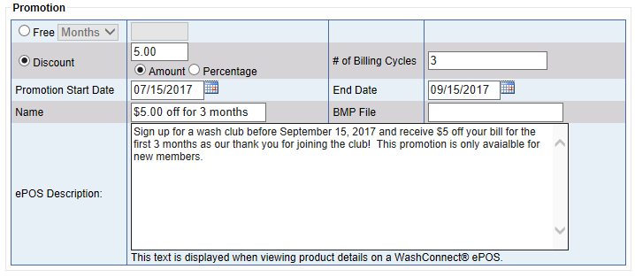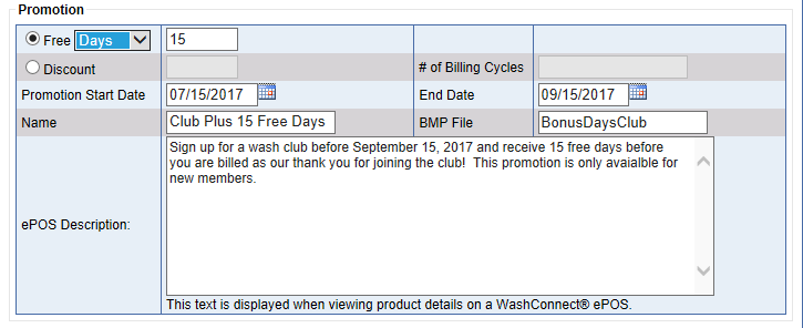 - In the ePOS Description box, type a description specific to the club promotion that will be displayed on the WashConnect ePOS during the promotion period, if it is setup.