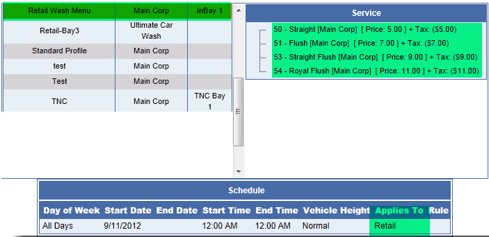 - Setup a Profile (Retail) for all exterior wash offerings and extra services. Setup a Schedule and select Retail from the Applies To list.