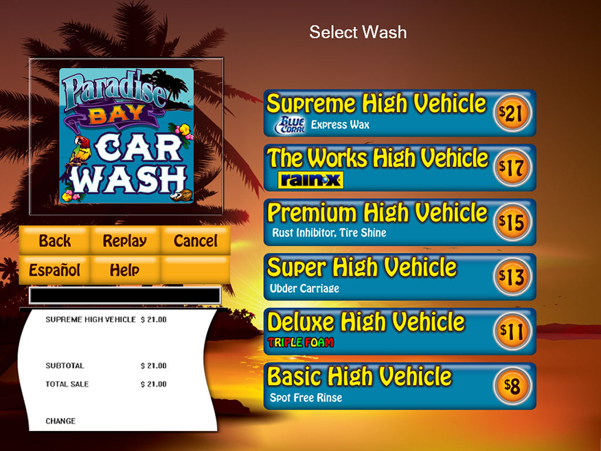 After installing a High Vehicle Sensor, truck, cargo, and conversion van customers, if detected, can receive a High Vehicle wash menu on the Auto Sentry. The wash menu below is set up with a High Vehicle Profile.