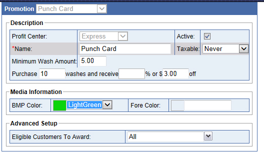The punch card promotion is now configured for all Eligible Customers. The WashConnect® system tracks the customers Promotions and Purchases, and the system will advise if available promotions exist for customer before transaction is finalized. Customer can redeem multiple punch card promotions.