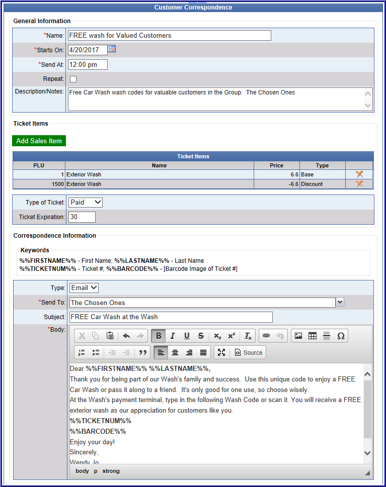 This email has been set up to automatically generate on the selected date and time, and all recipients will receive either a correspondence letter or a promotional email with a ticket number and bar code image.