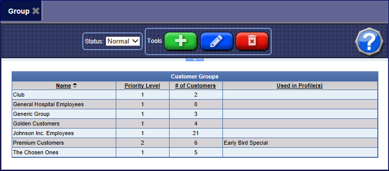 - From the Customer Groups listing, you can view the Customer Group Name, Priority Level, the Number of Customers in each Group, and the Profiles they are used in.