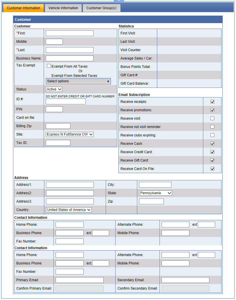 The Customer Information, Vehicle Information, and Customer Group(s) tabs appear with the essential tools needed to setup the Customer.