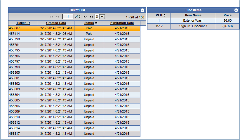 The View Site Tickets Report displays status information for tickets created at the local site or at corporate along with information such as when the ticket was created, when it will expire, the services included on the ticket, and the price of the services. Only tickets created at the local level (5 digit tickets) will show at the local level and only Global tickets (6 and 9 digit tickets) that are created will display when logged into corporate.