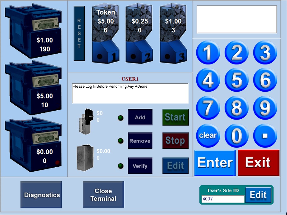 To perform any Cash Management or diagnostic functions on an Auto Sentry unit a user must first logon to the Auto Sentry Service Unit Screen. Users must have permission to enter the Service Unit Screen by having their User ID configured with a PIN for accessing the Service Unit Screen. Read the message box in the center of the screen for the next step to take.
