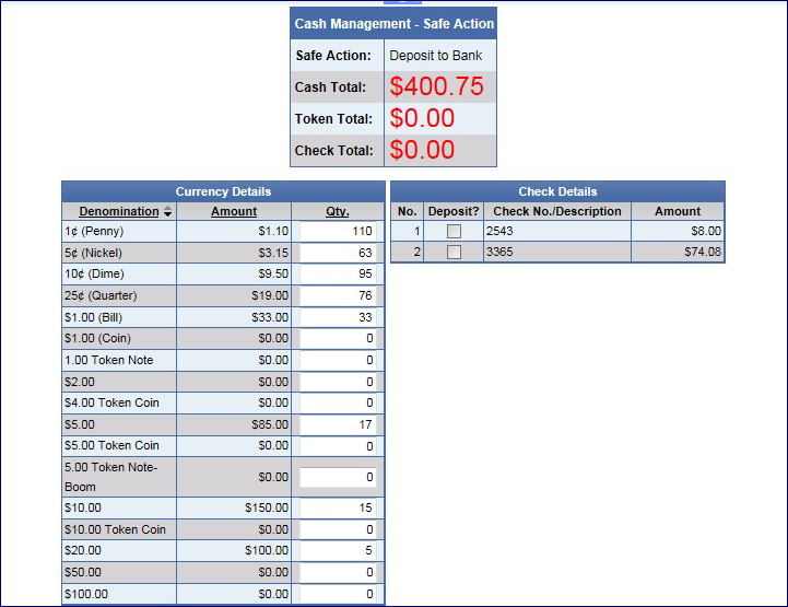 1. In the Currency Detail Qty. column, enter the quantities of the individual denominations that will be removed from the Safe and deposited into the Bank.  The section labeled Cash Total at the top of the Currency Detail section displays the amount that will be deposited into the Bank.