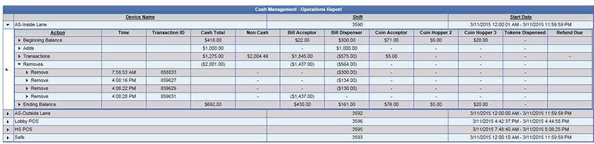 The Operations Report displays all Cash Management actions that have been completed per device at each site. The report shows the Beginning and Ending Balances for the device's shift and all Adds, Removes, Modifies, and Transactions that have been completed on that device. All transactions completed on the device will be shown with a breakdown of the payment for the transaction to include the money that was entered into the terminal and the money that was dispensed back as change. In the event change cannot be dispensed for a transaction the amount will be displayed in the Refund Due column on the report.