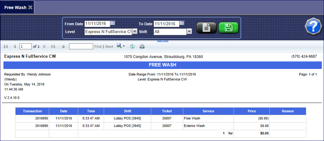 NOTE: At the bottom of the report, there is a total for the number of Free Washes given out during the report date range.