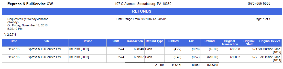 NOTE: For reports that include a count of cars washed, it should be noted that Refunds are never counted as actual cars washed.  They reduce the car count by preventing the initial transaction from being counted.