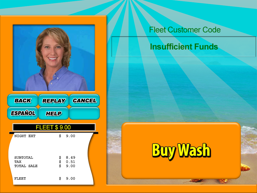 Funds can be added to a Prepaid Fleet Account at a POS, however, if the Prepaid Fleet Account does not have sufficient funds for the wash that the customer is purchasing at the Auto Sentry, the insufficient funds message will appear at the top of the screen. The Prepaid Fleet Customer will need to select the Buy Wash button, and purchase their own wash until funds are added to the Prepaid Fleet Account.