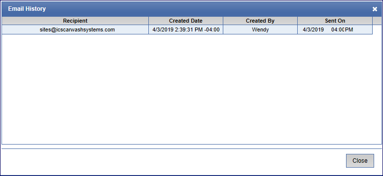 Email confirmation will be saved and available to review from within the Invoice tab from the Email History button which gives the user the ability to select an invoice and view the information regarding when an invoice was emailed to the customer.