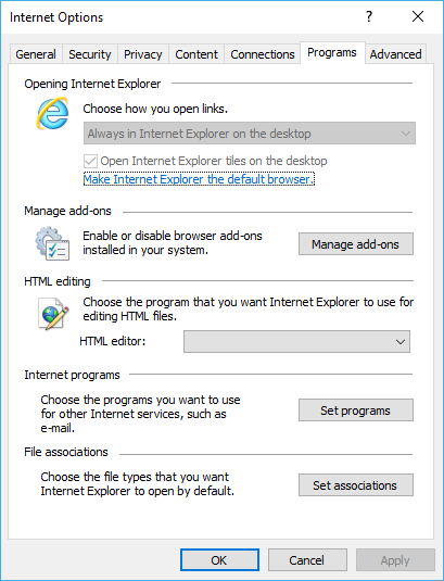 From the Opening Internet Explorer section, click the Make Internet Explorer the default browser.