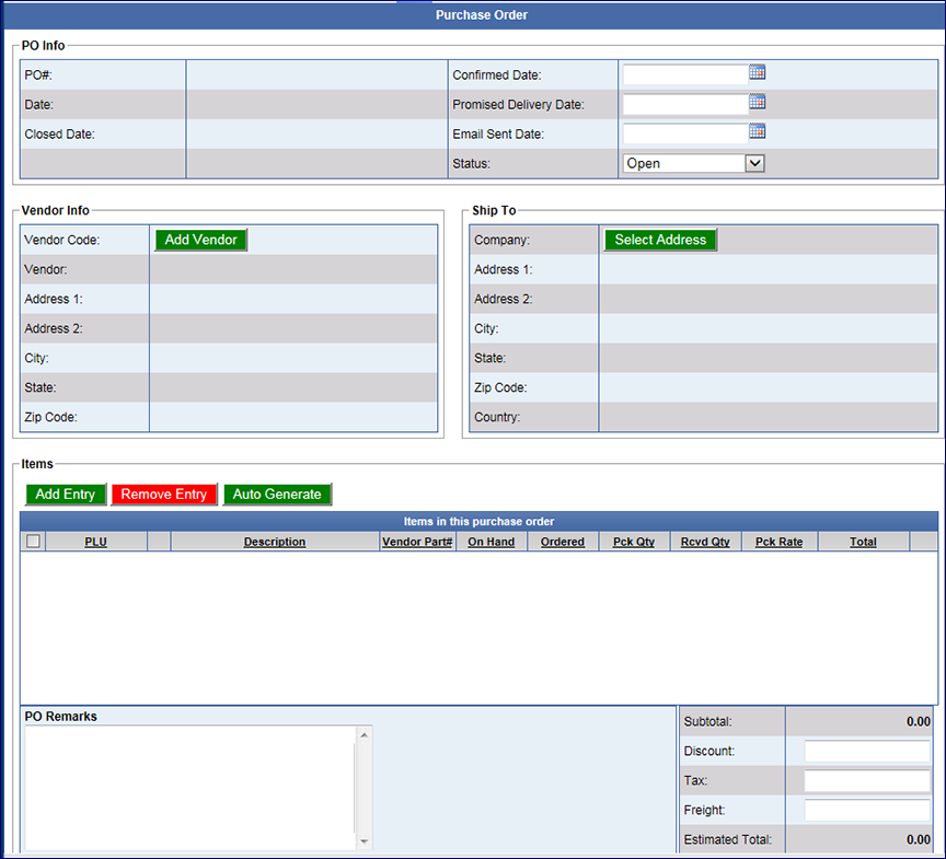 Click the Auto Generate button. Auto Generate will locate all items, based on the filters selected, that currently have On Hand Quantities below their Reorder Points and will order the quantities needed to stock the items to their maximum quantities.