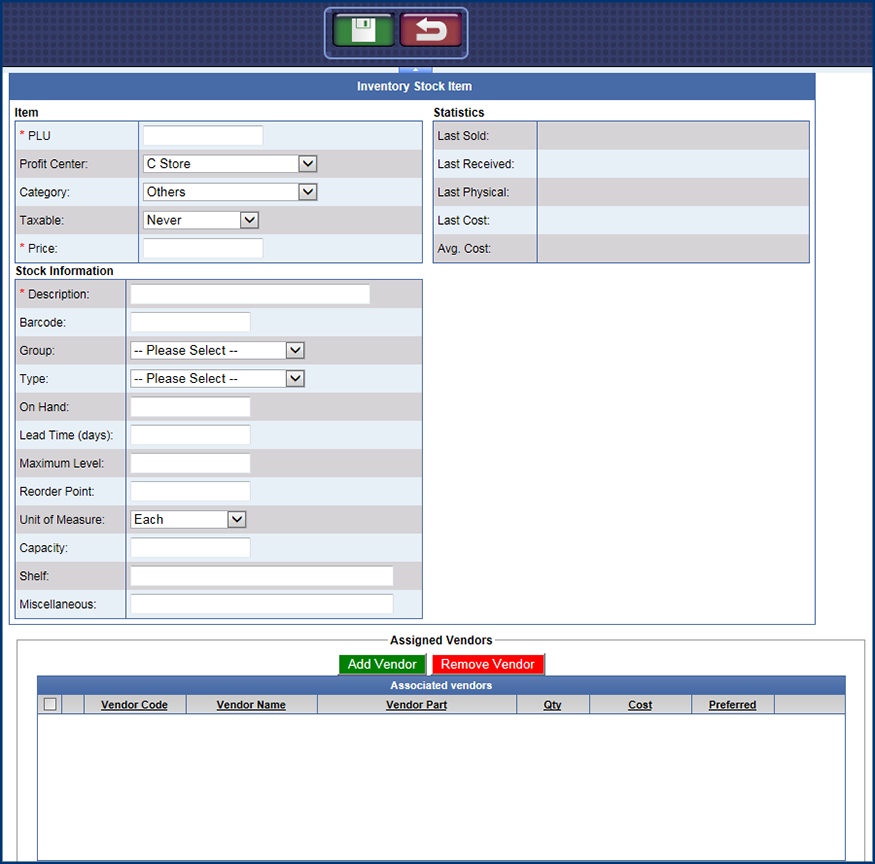 NOTE: From Corporate Logon, you can view but not add stock items.
