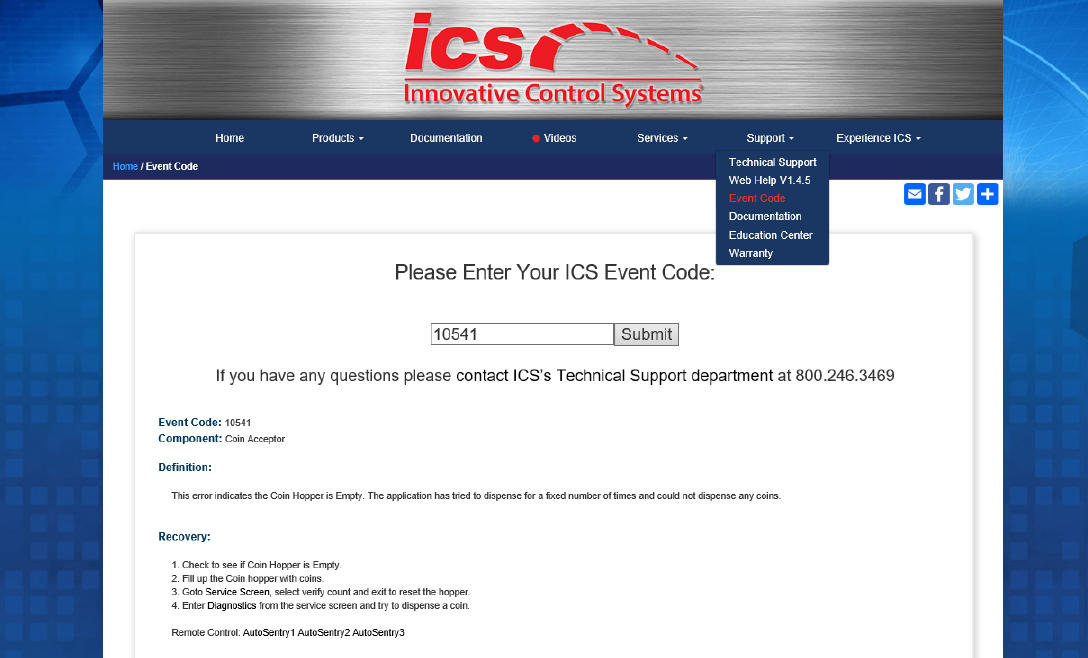 Each error or event code links to an online database with step-by-step troubleshooting instructions.