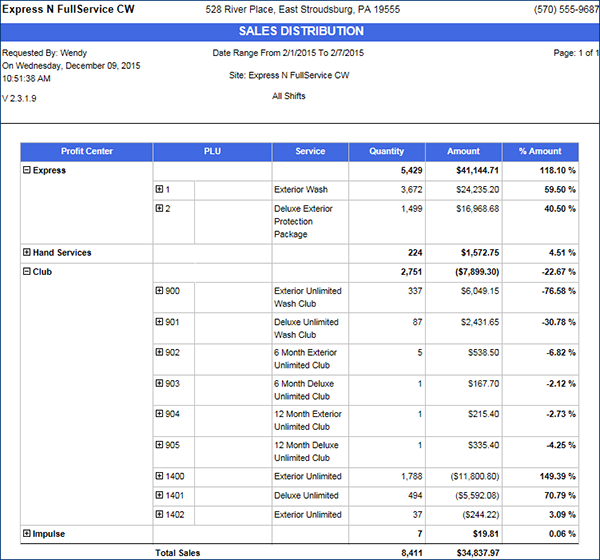 The Sales Distribution report shows sales item PLUs by quantity and amount for each profit center and as a total for all profit centers. The Sales Distribution report provides performance and volume information that can be used to compare services at the wash to determine the services customers are purchasing the most.