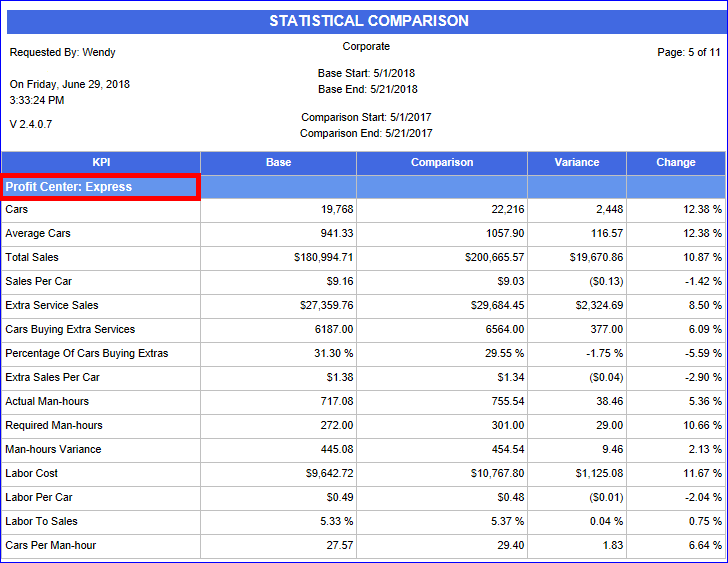 The Statistical Comparison Report is used to view the sales and labor performance of two separate time periods to determine which time period was more successful. The report will be broken down by Profit Center based on the user selections and can be viewed as a whole by selecting to view the Wash Totals. The Statistical Comparison Report is great when used to compare time periods when a promotion was running and when it wasn't to determine the success of the promotion.