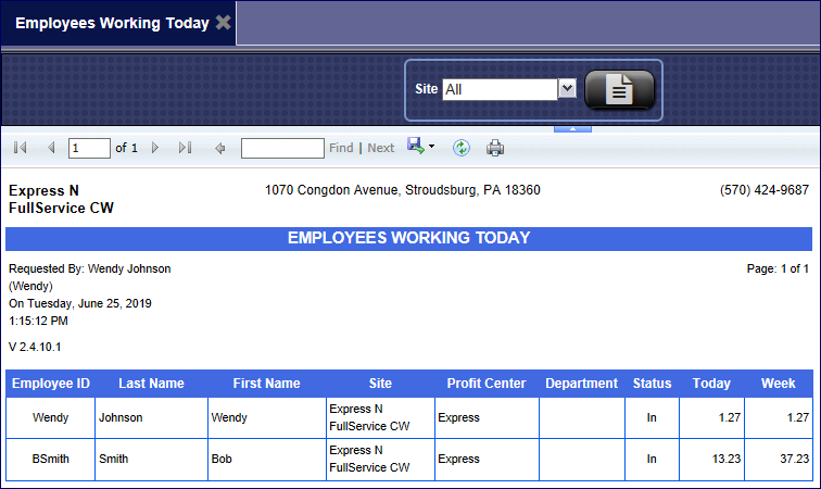 The Employee Working Today report appears. From the Report header toolbar, this report can be printed or exported.