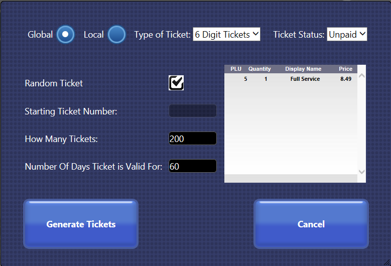 - In the Random Ticket box, click to select if you would like generate random wash code numbers. Clear the Random Ticket box to activate Sequential wash code numbered tickets.