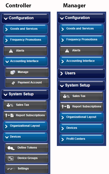 In the above illustration, the first menu appears for users who log on with the role of Tri-State Controller or Mid Atlantic Controller. The second menu appears for Tri-State Manager or Mid Atlantic Manager.