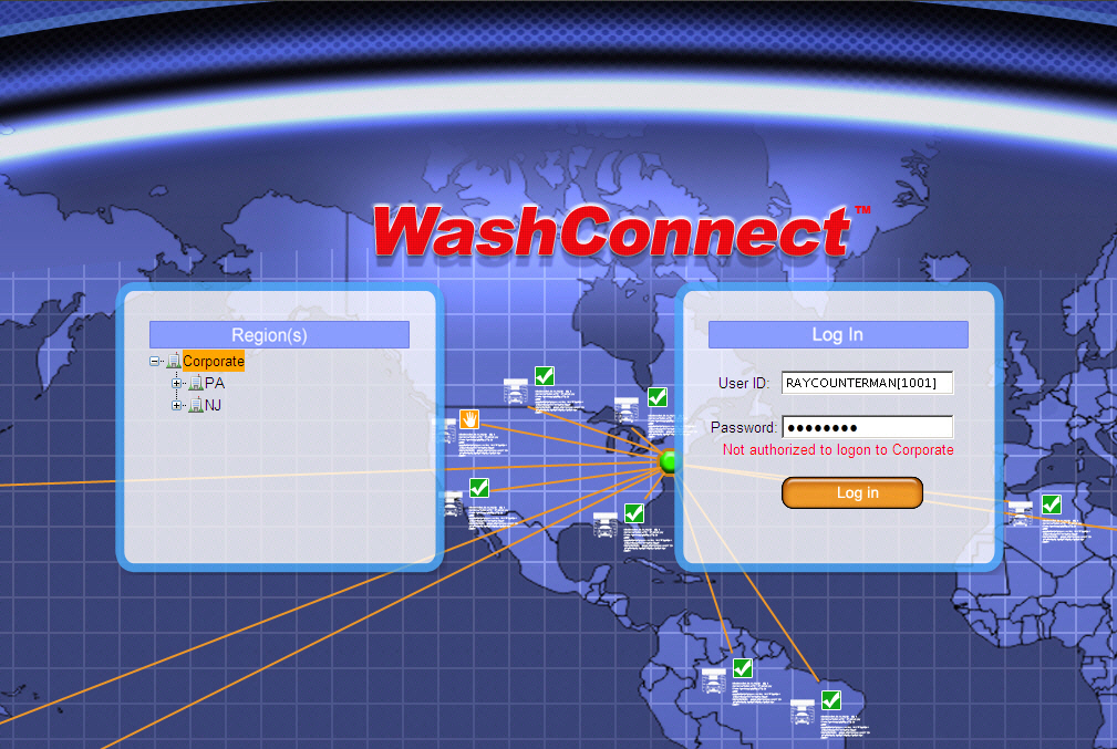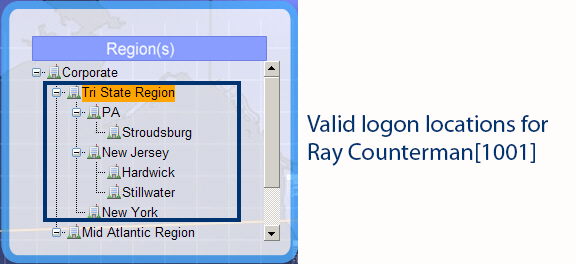 In the above illustrations, Ray attempted to log on at the Corporate Region. The error message "Not authorized to logon to Corporate" appears. Valid selections include Tri State Region and all child locations underneath it.