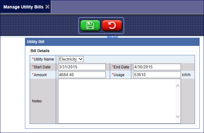 - In the Notes box, enter any notes associated with this utility bill. (i.e.: wash was closed for 2 weeks for repairs so usage was very low.)