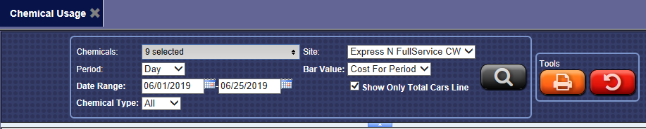 To view a Chemical Usage bar chart, along with information on the number of vehicles washed, follow these steps: