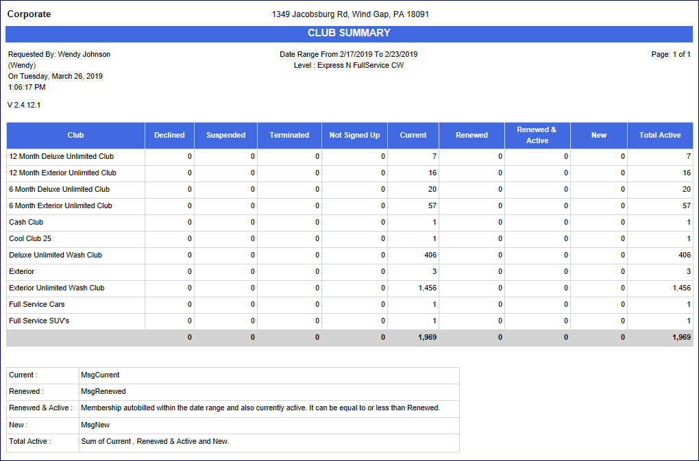 The report shows the most recent program membership that applies to each program member. Therefore, if a customer was declined to start the month and later in the month opted to terminate the membership, the report counts the membership as terminated and not declined. But if the report date ends before the termination, the report would count the membership as declined. The sum of Renewed & Active, Current, & New columns give you the Total Active for the time frame.