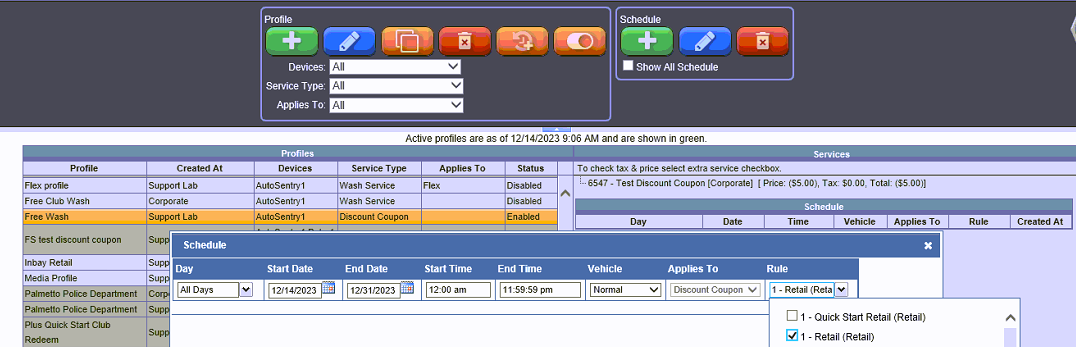 NOTE: When setting a schedule for a Discount Coupon Profile, select a Rule which is essentially the profile (retail/flex/club) to apply the discount coupon to.