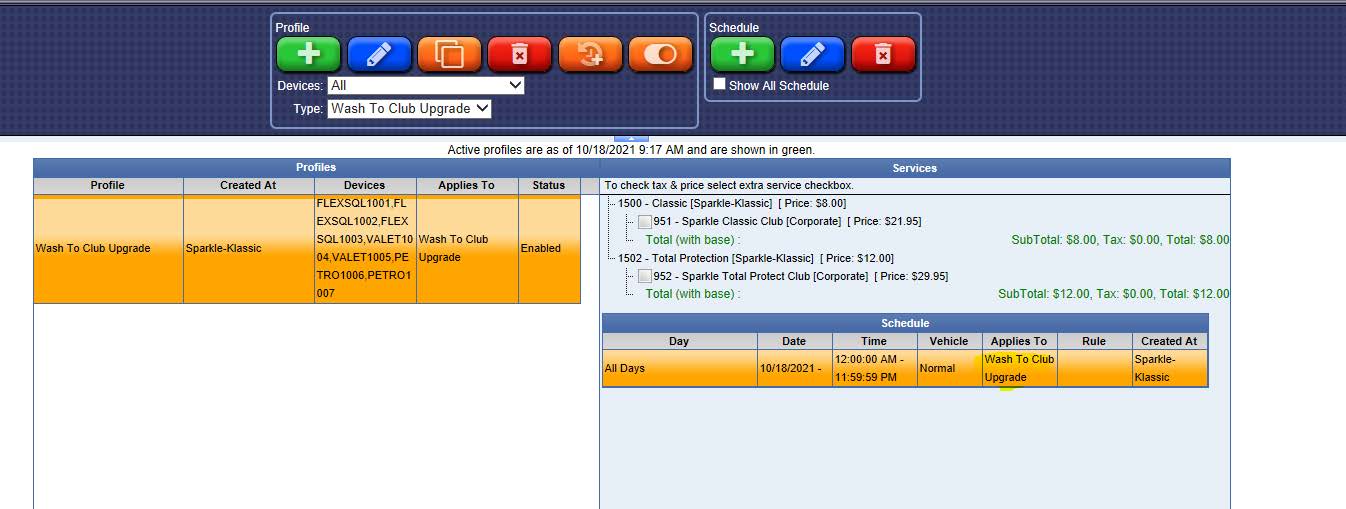 - Add a Schedule time for the upgrades to be available, and in the Applies to column, select Wash To Club Upgrade.