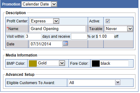 Set up a promotion for groups of customers to be eligible to receive if they visit the car wash on or close to a specific date. Calendar Date promotion can be set up with as multiple promotions.