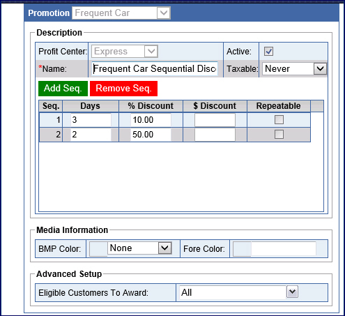 Customer can join the frequent car program for a nominal fee and receive discounts tracking by license plate. Customers buy into loyalty with this Promotion. Frequent Car is set up one time only as it is a single promotion.