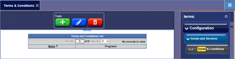 - Configuration > Goods and Services > Terms & Conditions.