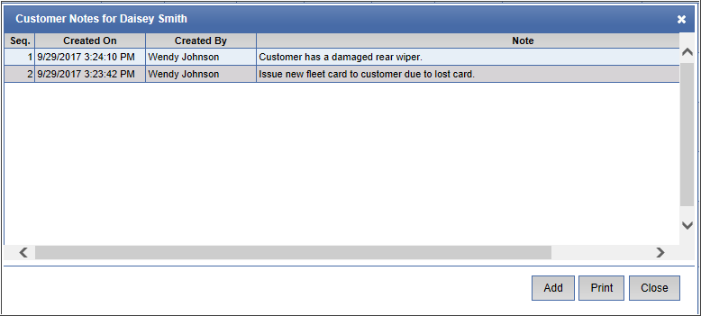 NOTE: Customer and Vehicle notes can be viewed and printed by selecting the note button under Notes column for that specific customer. If there are two Note buttons for same customer, the top Note is for Customer Notes and the bottom Note is for Vehicle Notes.