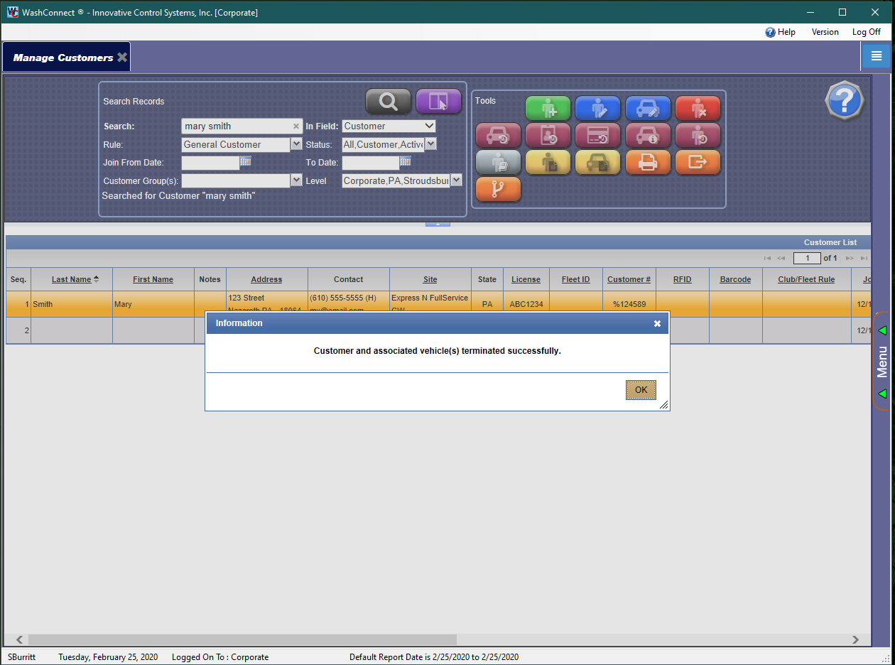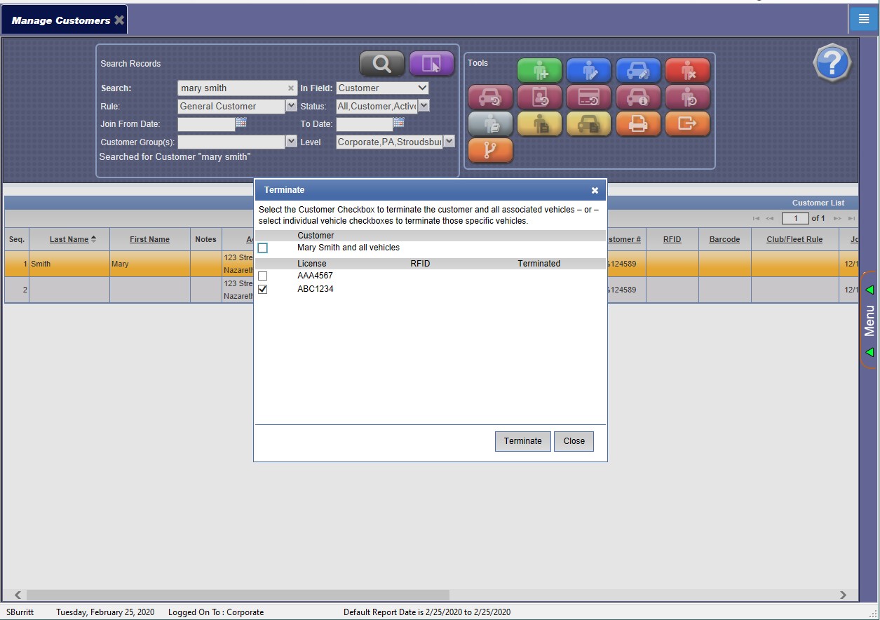All customers and vehicles can be terminated from the Manage Customers tab, including Fleet Customers. A club membership is based on the customer's vehicle, and therefore the customer record does not need to be terminated to terminate the club.