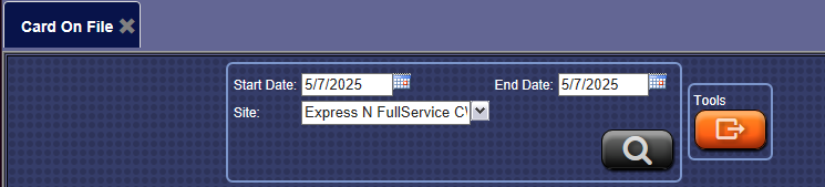 - In the Site box, select a site from your Corporate structure to view the Cards On File.