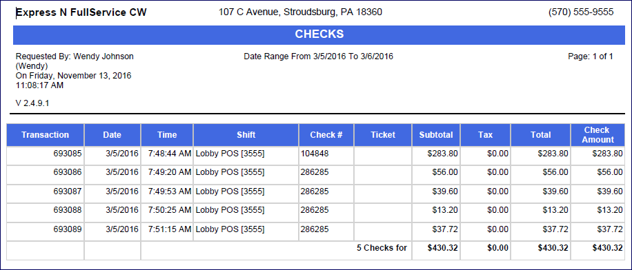 The Checks Report appears including Check #, Price, Tax, Total, Billed, and Ticket number (if applicable).