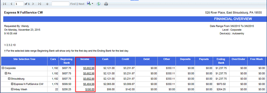 For example, if you click an underlined total in the Income column, the Shift Detail Report appears in a new tab, displaying the details of the total Income.