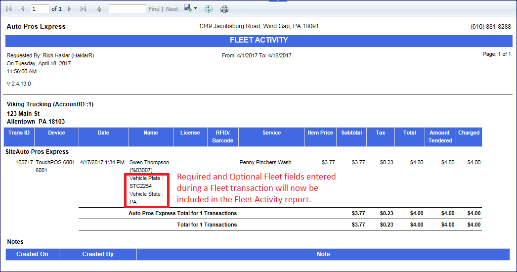 The Fleet Activity report appears. Every fleet customer begins on a separate page of the report.