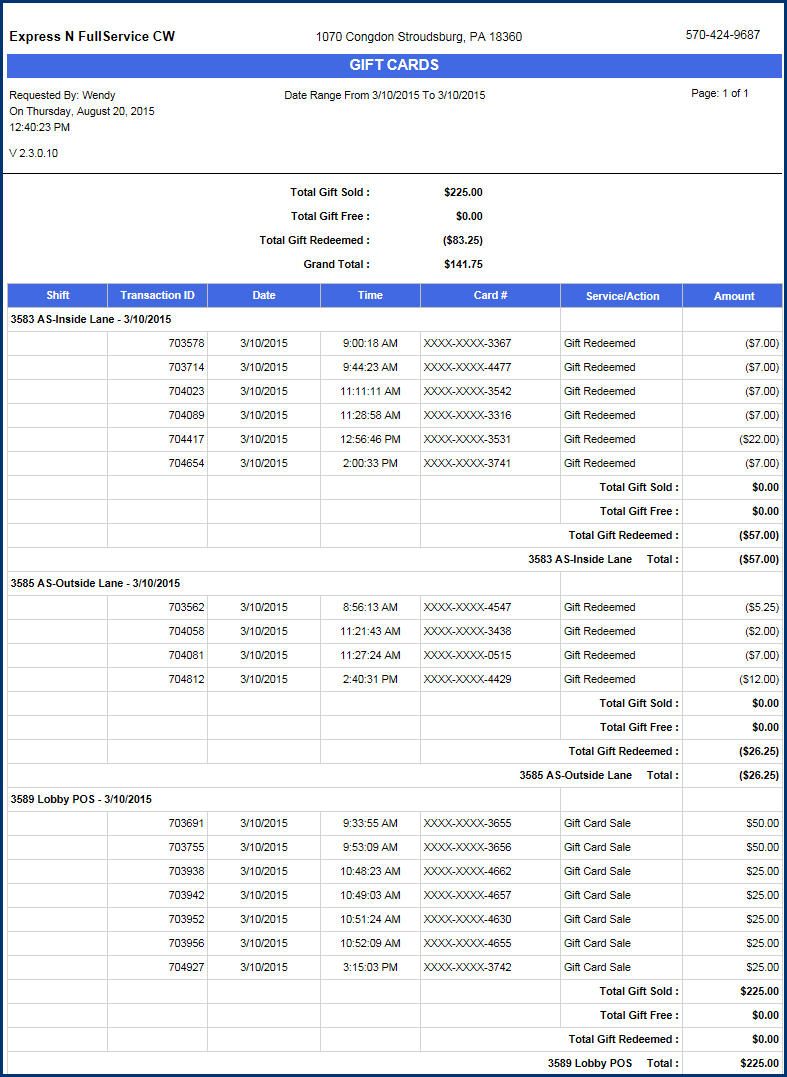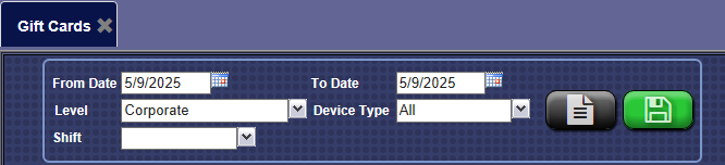 - From the Gift Cards report toolbar, you can Export, Save, or Print the report.