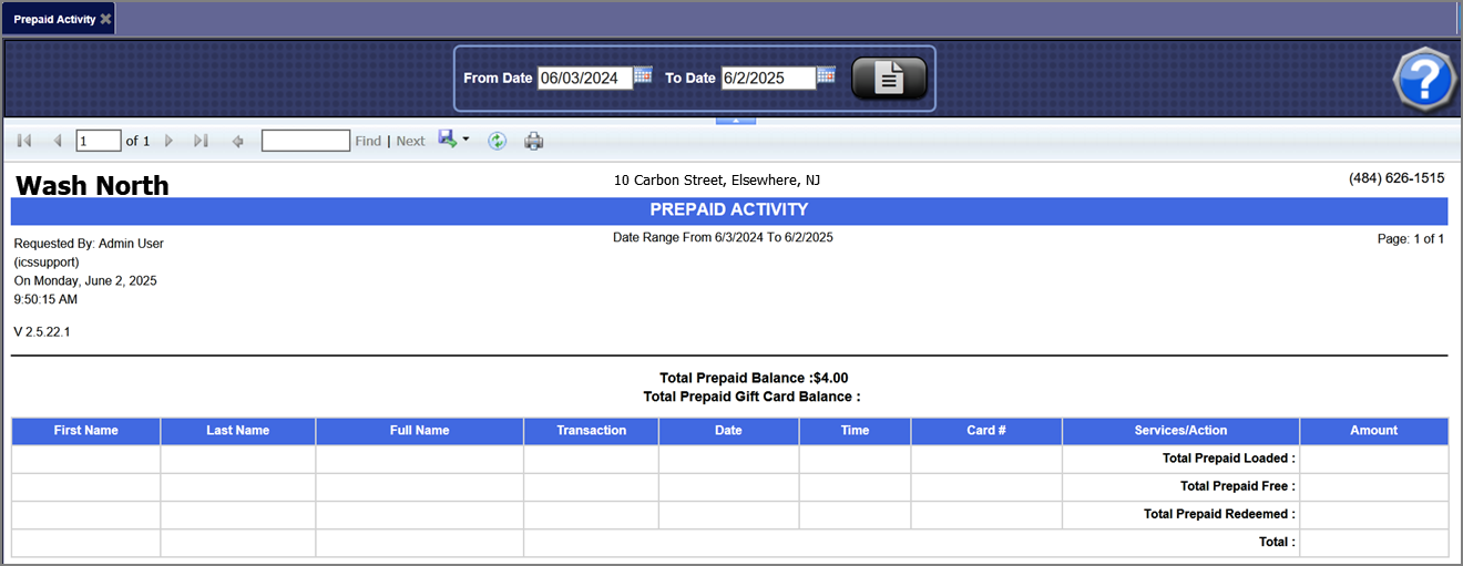 From the Prepaid Balance report toolbar, you can Export, Save, or Print the report.