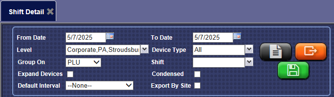 - From the Shift Detail report toolbar, you can Export, Save, or Print the report.