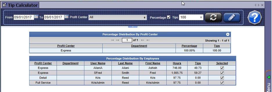 As shown above, since Express is 100% and none of the other profit centers have any assigned value, there would be no tip value available for the Kris and KrisAdmin users since their hours worked were attached to different profit centers outside of the percentage assignments.